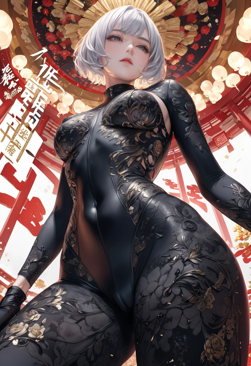 画面以浓烈的红与深邃的黑为主调,赋予整体一种既热情又冷冽的气质。身后的樱花在红墙映衬下显得柔美且生机勃勃,而柔光吊灯洒下的光芒,则为人物的轮廓增添了一层诱人的光晕,让每一张画面都散发出一种致命的吸引力。她们身着贴身黑色战衣,极致修身的设计将每一寸曲线勾勒得淋漓尽致,蕾丝的纹理在光影下若隐若现,如同攀附在肌肤上的暗夜花纹,性感中透着几分危险。战衣的剪裁大胆而不失优雅,深V、贴合腰线、延展至大腿的流畅设计,完美地将柔美与力量平衡到了极致。